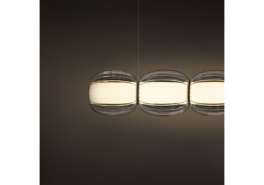 Alma designed by Controvento for Contardi is a chandelier made of blown glass and a pleated fabric diffuser. It features a custom LED strip, dimmable with phase-cut (Triac) dimming, with DALI, 1–10V, or CASAMBI options.