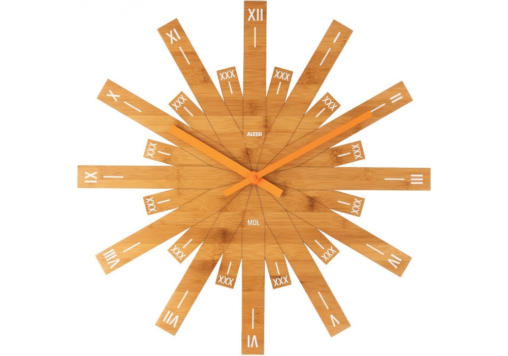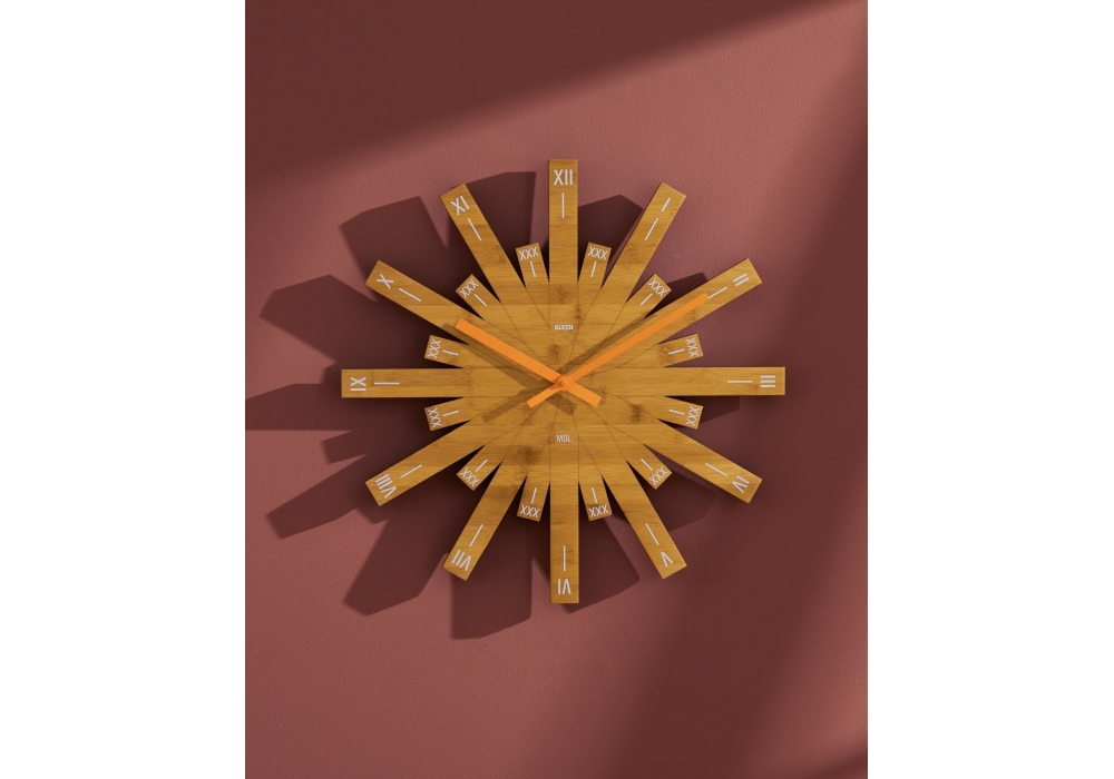 Raggiante designed by Michele de Lucchi for Alessi is a wall clock made of bamboo wood.