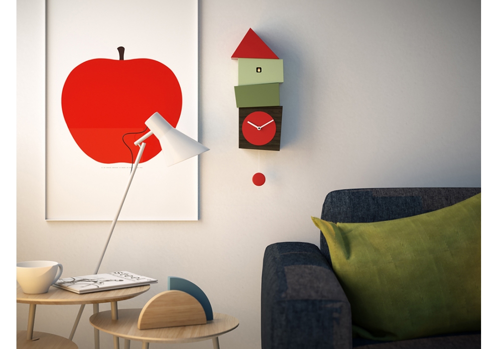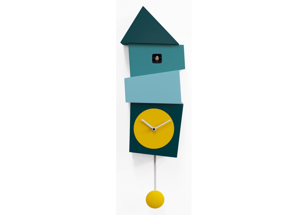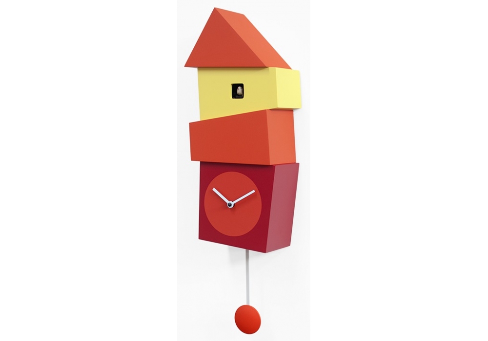 Crooked designed by Alberto Sala for Progetti is a cuckoo clock made of wood and painted with non-toxic paints. Battery-operated quartz movement with a photosensitive sensor that automatically interrupts the ringtone in the absence of light. Available in different finishes.