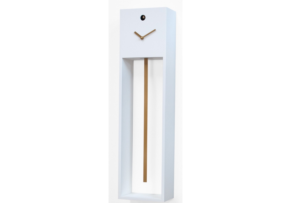 Uaigong designed by Davide Tonizzo for Progetti is a wall or cuckoo clock made of varnished wood. Available with battery-powered quartz movement or battery-powered cuckoo movement with photosensitive sensor that doesn't make it sing when it's dark, and a push-button panel allows you to adjust the intensity of the sound or turn it off completely. Available in different finishes.