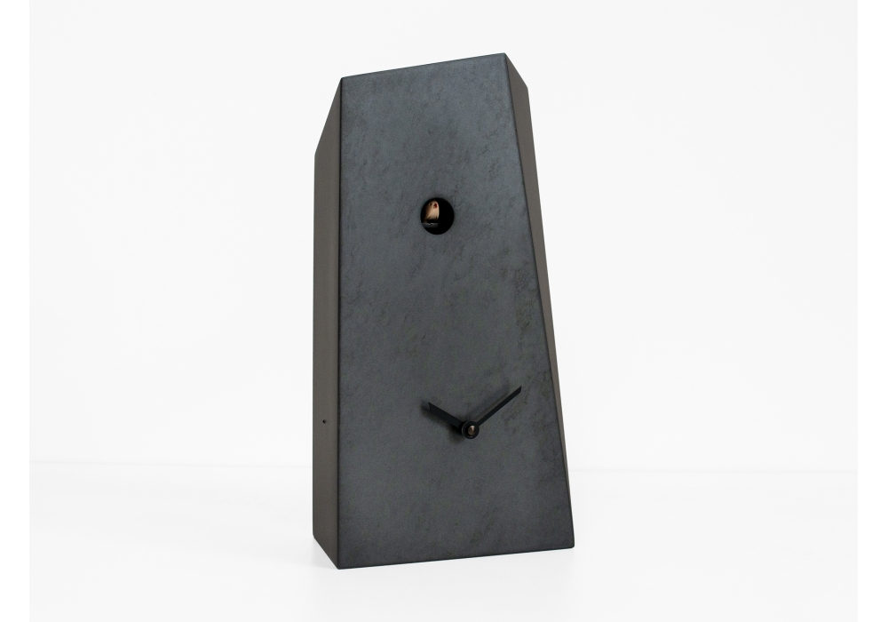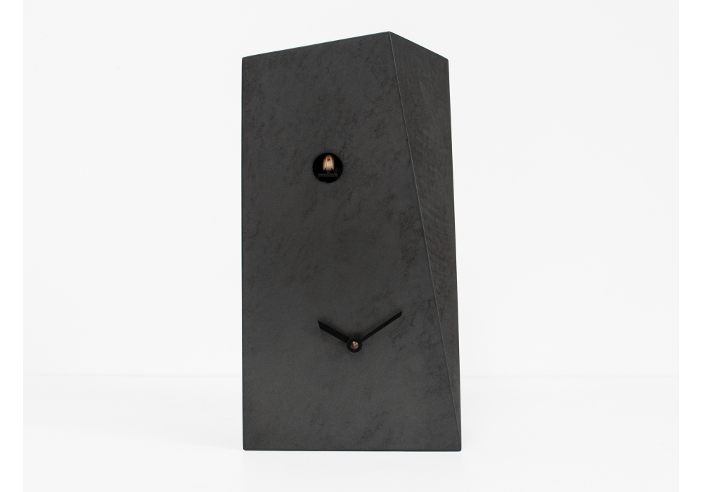 Monolith designed by Ewald Winkelbauer for Progetti is a table cuckoo clock with wooden structure painted with non-toxic paints or finished with a liquid metal-based paint that makes it precious and unique (black bronze finish). The cuckoo movement, of German design, is of high quality and is powered by two batteries, has a photosensitive sensor that does not make it sing when it is dark. A push button allows you to adjust the intensity of the sound or turn it off completely.