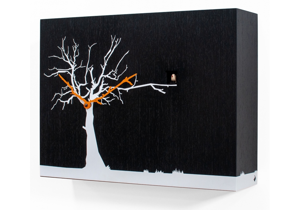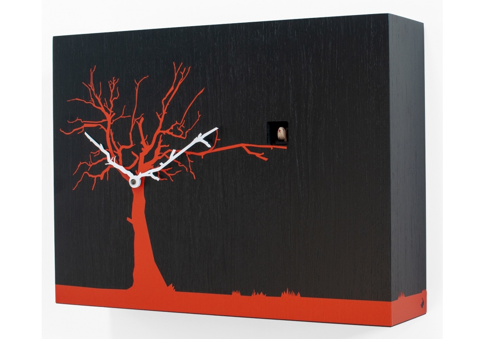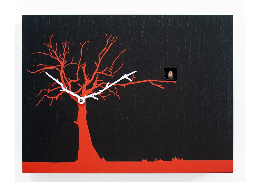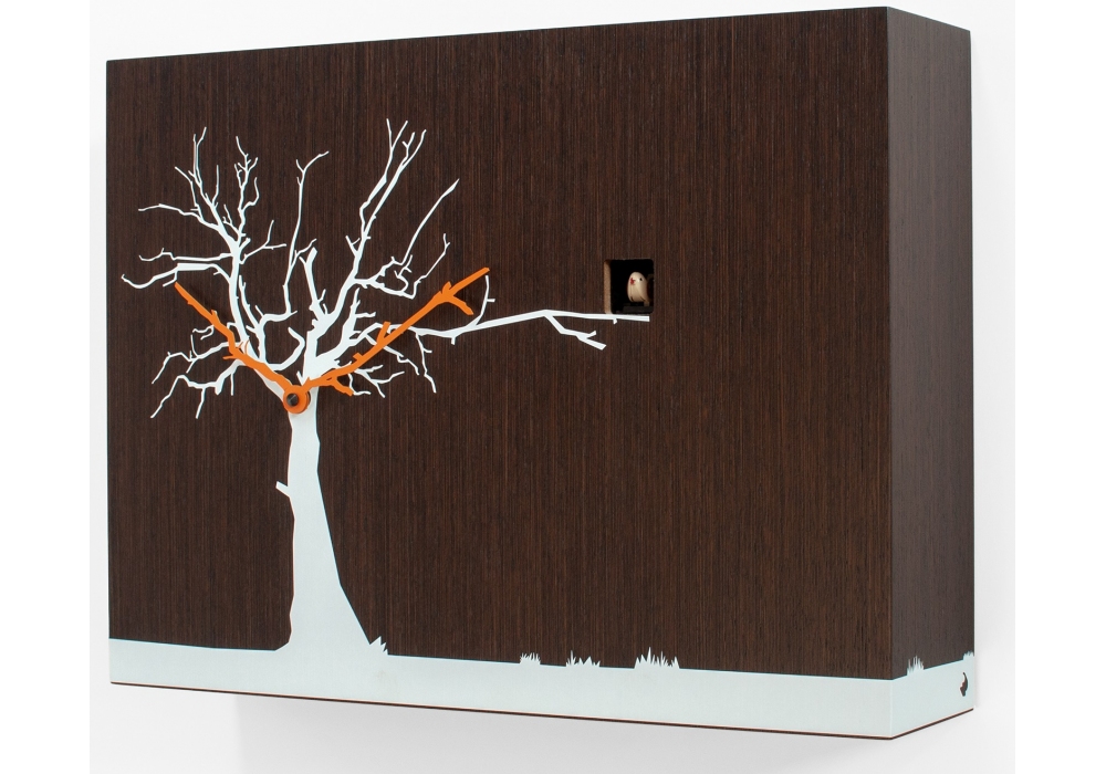 CùCùRùKù designed by Riccardo Paolino & Matteo Fusi is a cuckoo clock made of wood. Battery operated quartz movement. A light sensitive sensor automatically stops the ringer in the absence of light. Available in different versions.