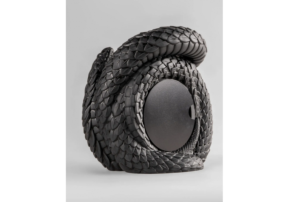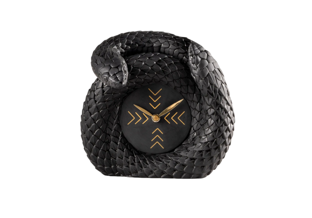 Snakes designed by Robert Schnyder for Lladró is a porcelain table clock with a matte black finish and a decoration with crossed snakes in gold color.