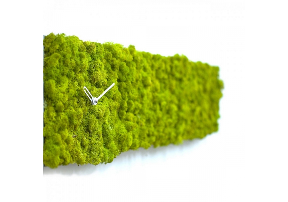 Clock_Circle designed by Studio Kuadra for Progetti is a rectangular clock made of steel and Moss lichen by Verde Profilo. Battery operated quartz movement. It is possible to hang it from all sides.