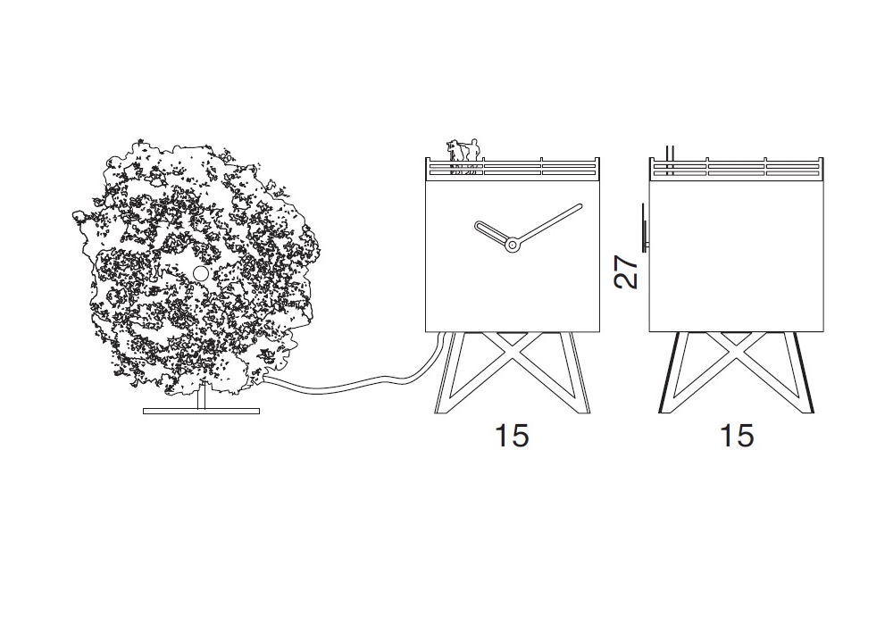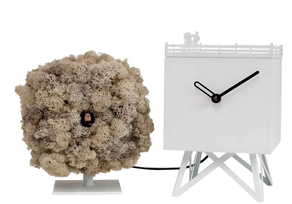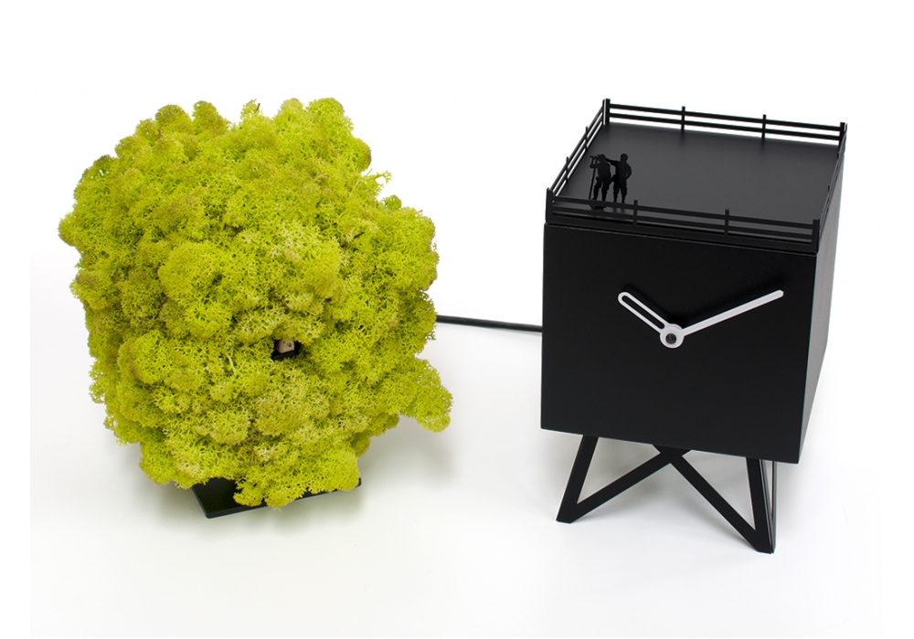 Birdwatching designed by Studio Kuadra for Progetti is a table cuckoo clock with a wooden lookout house, where two shapes are positioned, and the "tree" where the bird is housed is made of stabilized lichen that can be used in indoor environments without lighting natural without undergoing variations. The cuckoo movement, of German design, is of high quality and is powered by two batteries, has a photosensitive sensor that does not make it sing when it is dark. A push button allows you to adjust the intensity of the sound or turn it off completely. Available in different finishes.