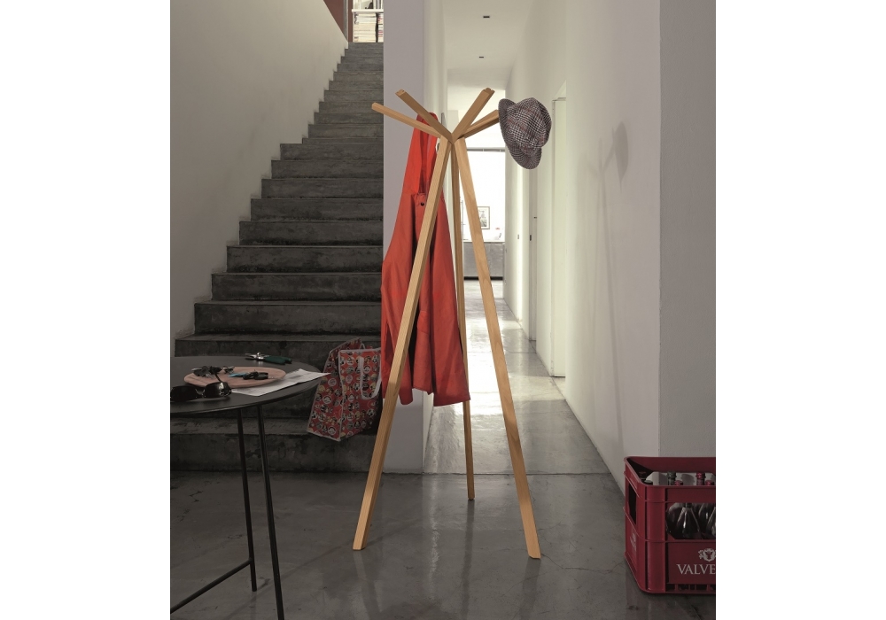 Rokumaru designed by Nendo for Depadova is a coat stand with structure in solid ash with steel insert, bleached aniline-stained or wenge-stained, finished with transparent water-based or solvent-based paint. Feet in thermoplastic.