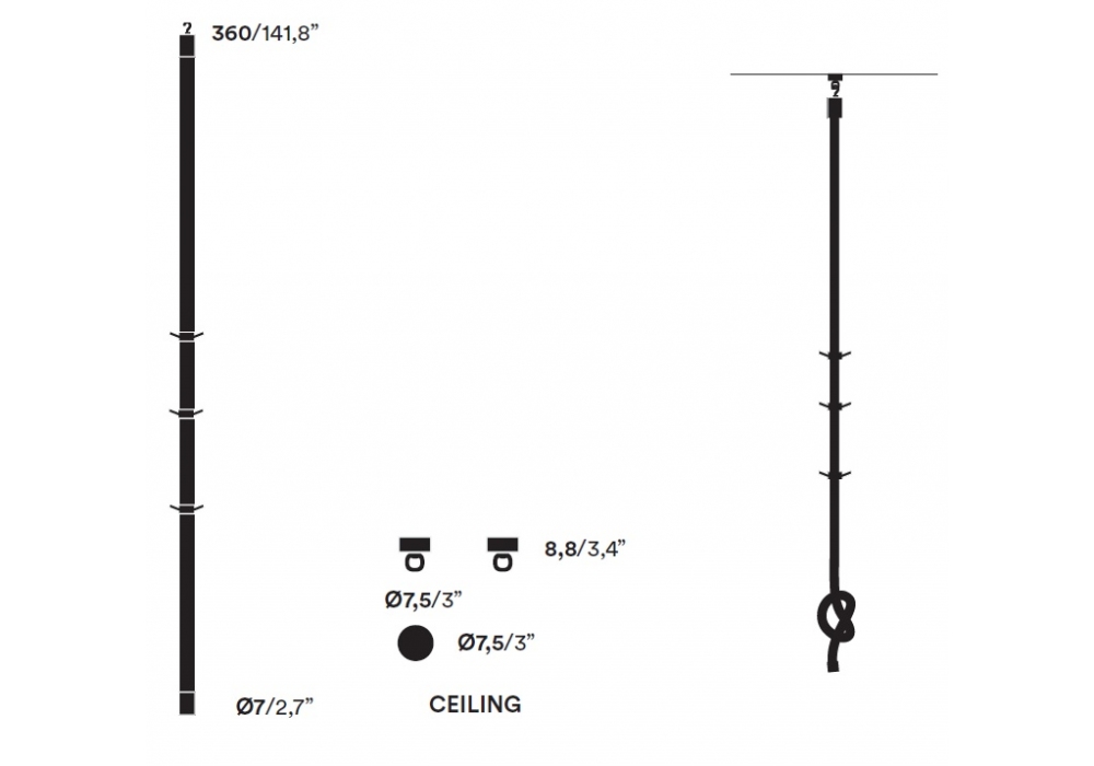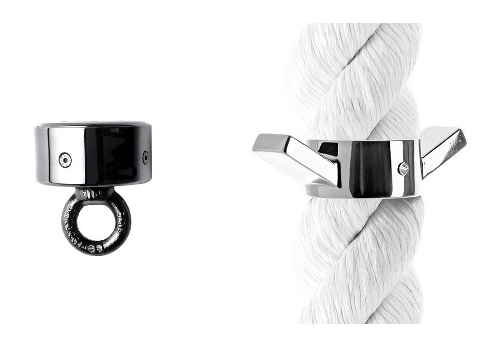 La Cima designed by Lapo Ciatti for Opinion Ciatti is a ceiling coat hanger made with metal hooks and rings and braided nautical rope. Available in different finishes.