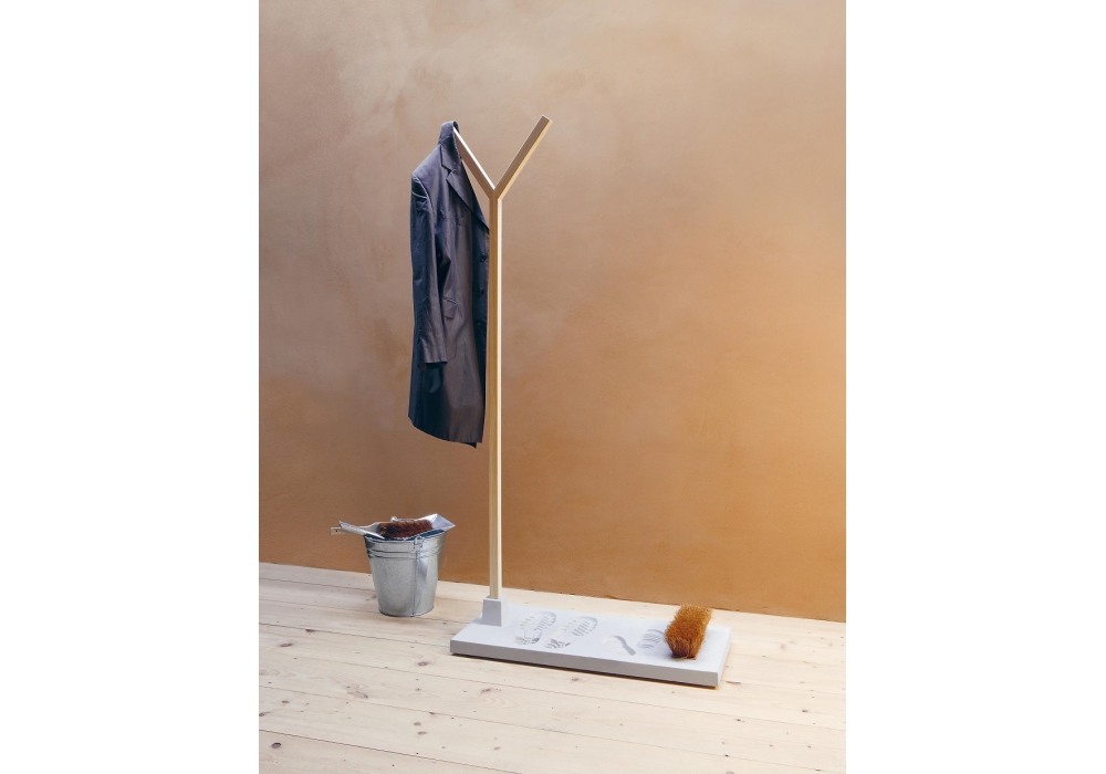 Stellvertreter designed by Stephan Schulz for Moormann is a coat rack stands with structure made of ash wood and concrete base. Also available in 2 types. Don't stand on the base! The base is only supposed to be a storage for shoes.