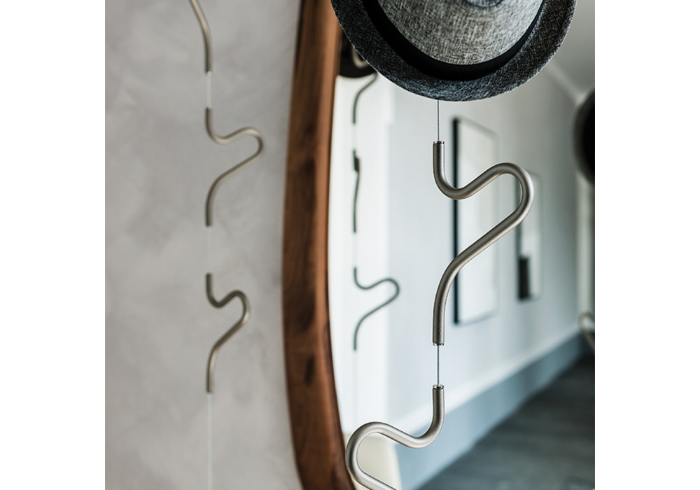 Air designed by Pio & Tito Toso, A. Quaggiotto for Cattelan Italia is a ceiling-mounted coat rack with steel cable and details available in different finishes: chrome-plated, embossed titanium, painted white, black or opaque yellow. It is possible to integrate an additional 3 meter steel cable.