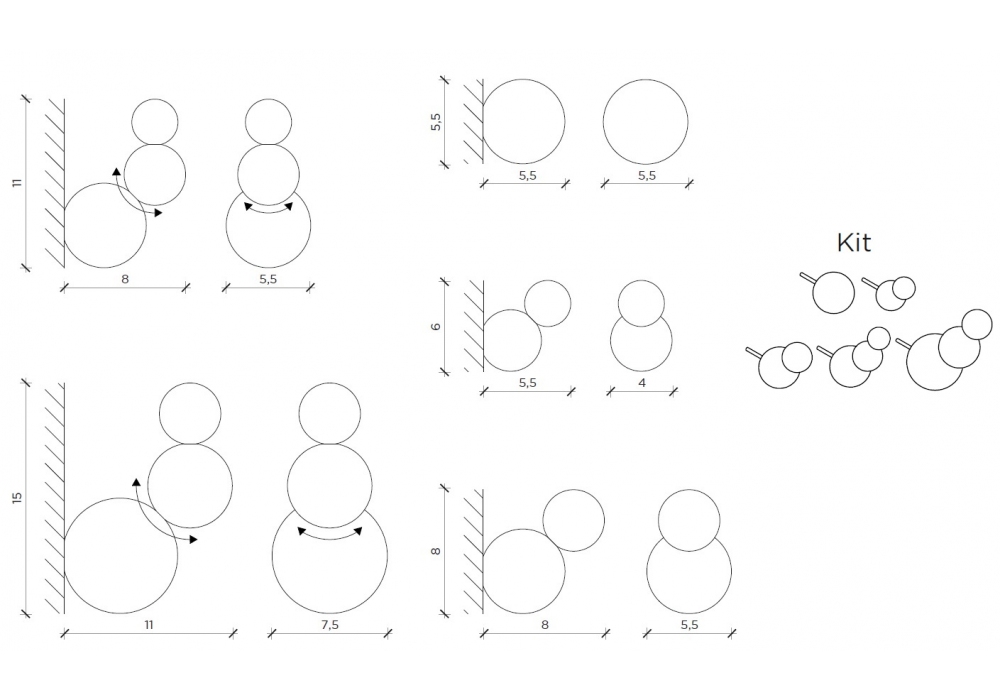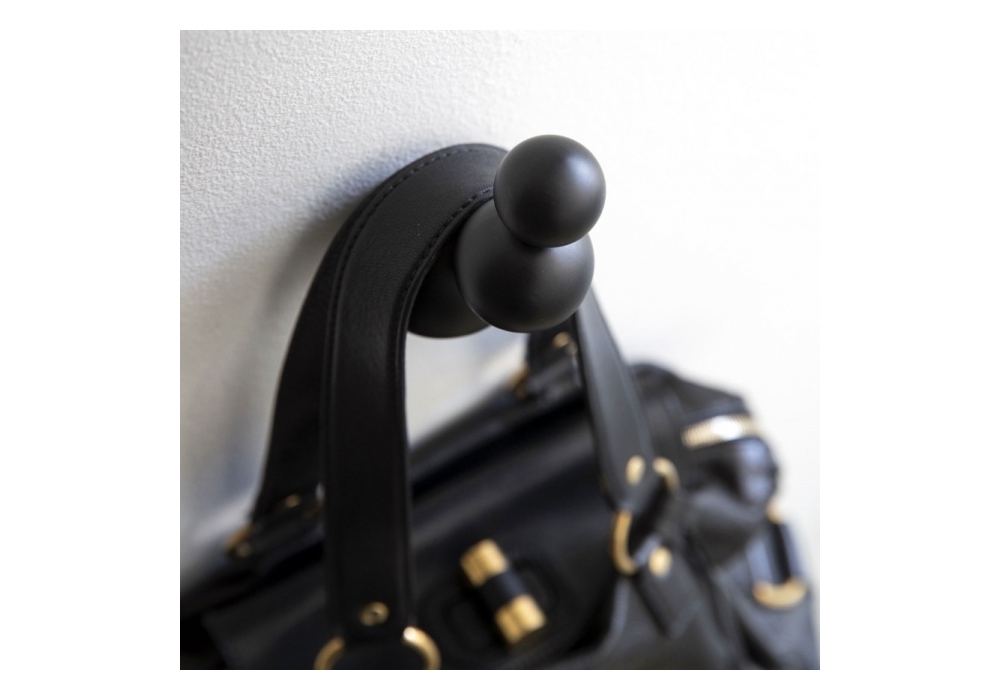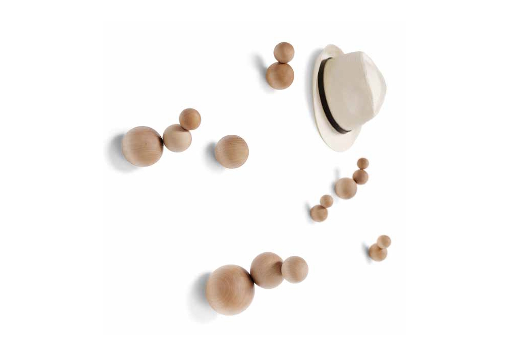 Bubble designed by Annebeth Philips for Mogg is a kit of 5 wall coat hangers in turned beech wood in 5 different sizes. Available in natural wood or matt black lacquer. The terminal part of the two 3-sphere elements is adjustable.