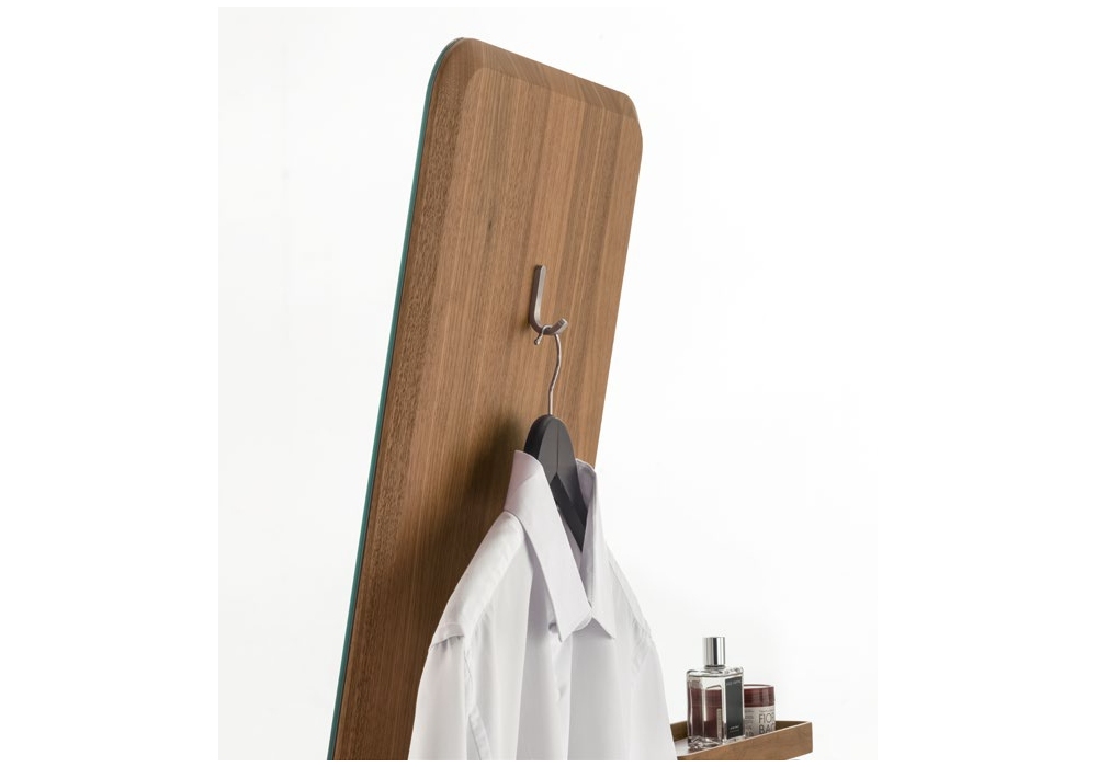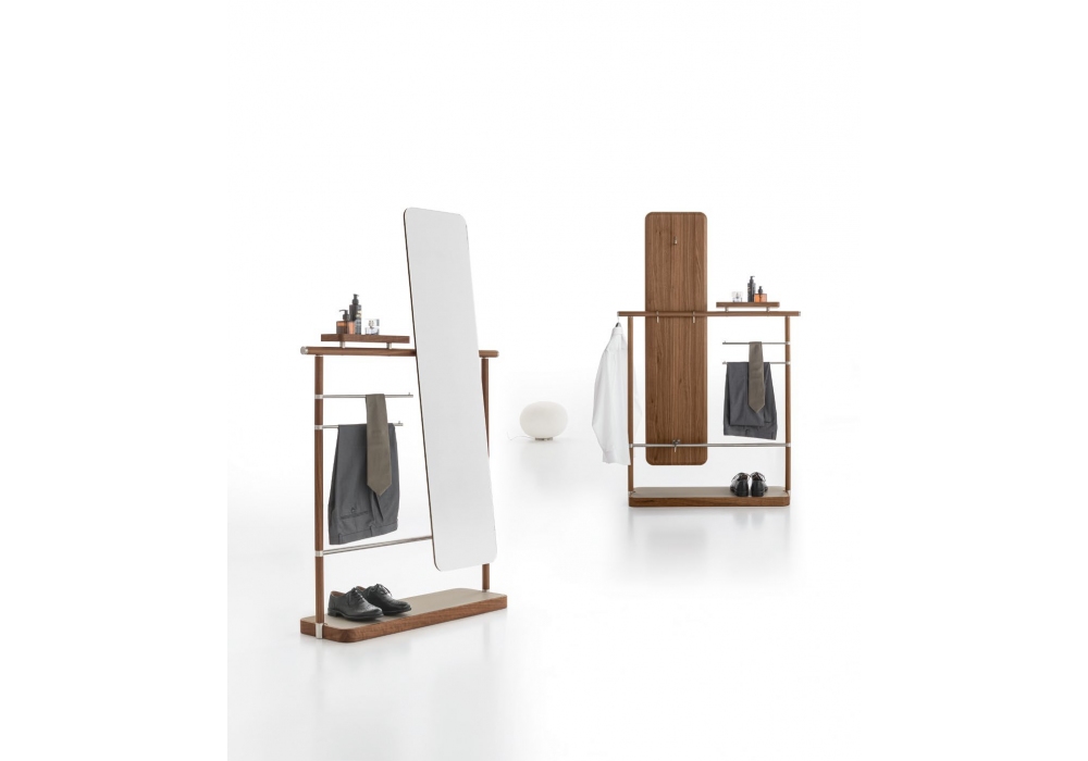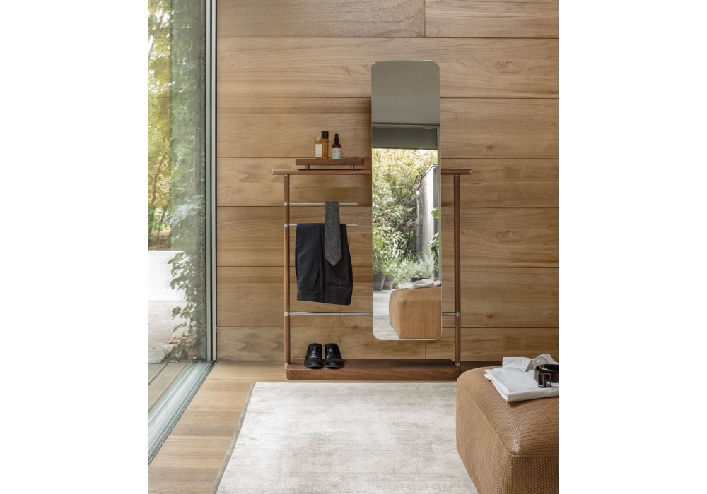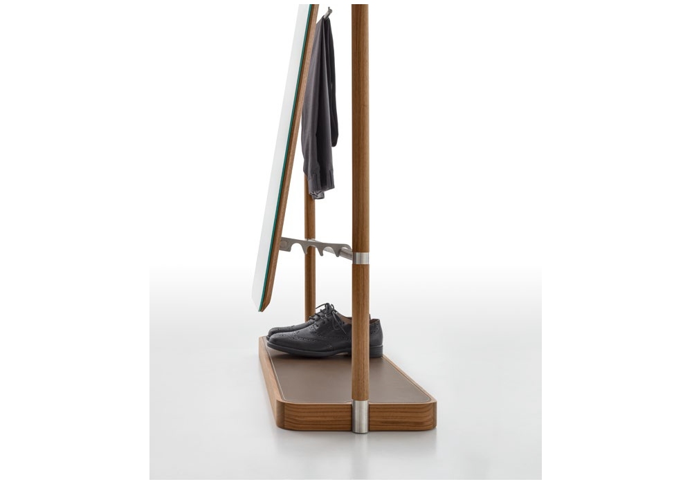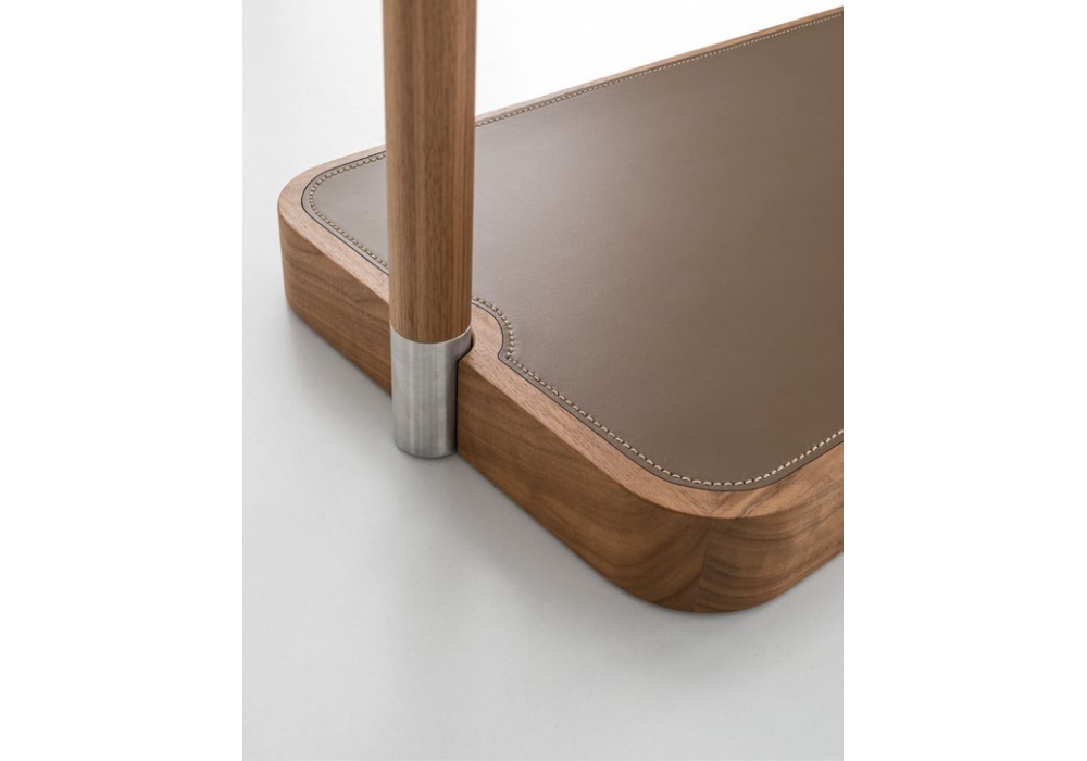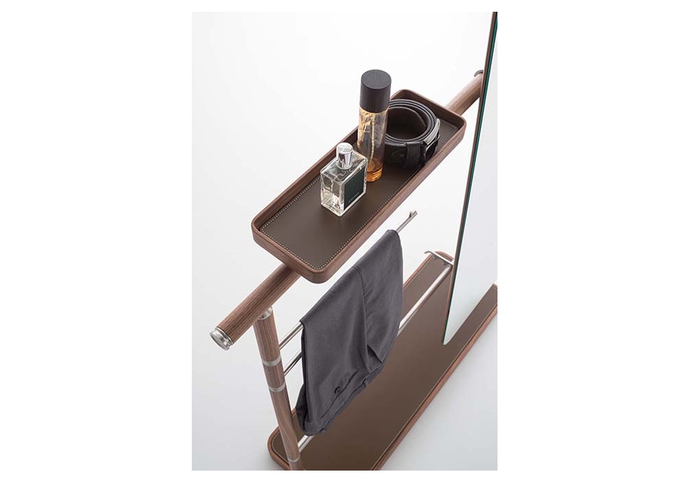 Ben designed by Giuseppe Bavuso for Alivar is a valet stand made with tubular aluminum structure and canaletto walnut veneer. Garment bars in brushed steel. Equipped with storage tray in solid walnut with insert in C32 coffee leather, tilting and adjustable mirror with satin steel coat hook. Base in solid walnut with insert in marble or in C32 coffee leather with decorative stitching.