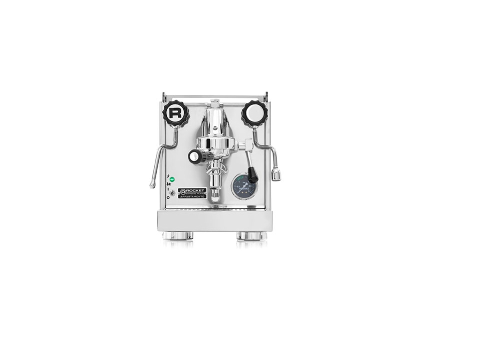 Appartamento designed by Rocket Espresso is a coffee machine in stainless steel or Serie Nera edition, with body in black stainless steel and matching cup frame. Both the Stainless and Black Series editions have the option of white or copper circular side inserts.