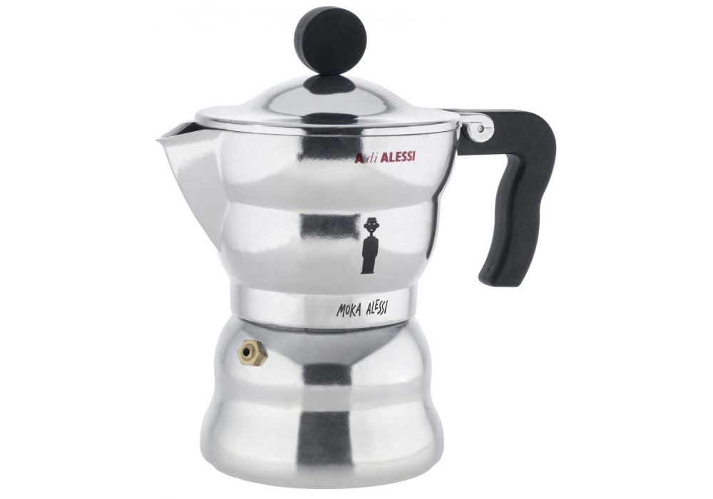 AAM33 Moka designed by Alessandro Mendini for Alessi is an espresso coffee maker in aluminium casting. Handle and knob in thermoplastic resin, black. Available in 1, 3 or 6 cups.