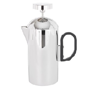 Brew designed by Tom Dixon is a plunger coffee maker made of steel with a shiny silver finish.