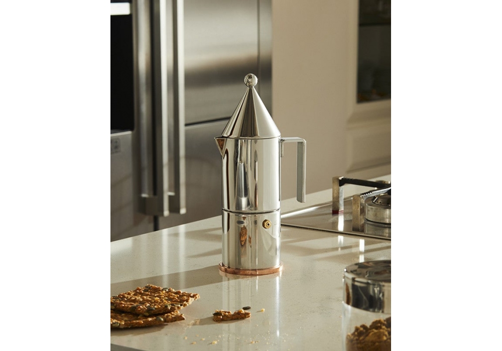 La Conica designed by Aldo Rossi for Alessi is an espresso coffee maker made of 18/10 stainless steel with copper bottom. Available in 3, or 6 cups.