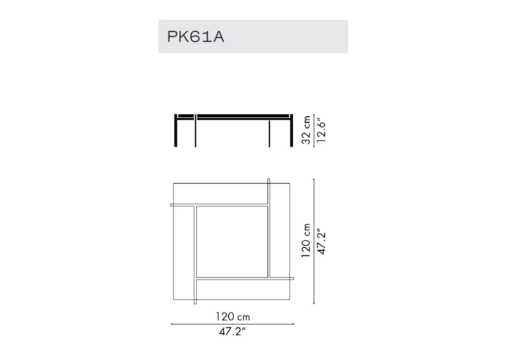 PK61A designed by Poul Kjærholm for Fritz Hansen is a coffee table made with base in brushed satin stainless steel and top in marble, granite or glass.