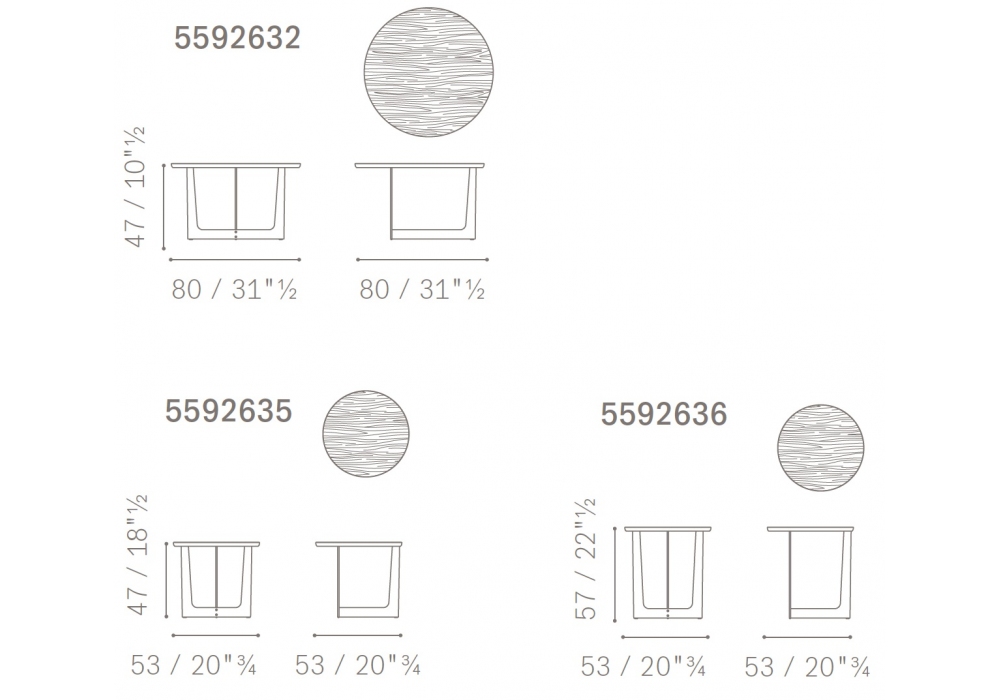 | Dimensions | Ø 80 cm x H 47 cm; Ø 53 cm x H 47 cm; Ø 53 cm x H 57 cm. |