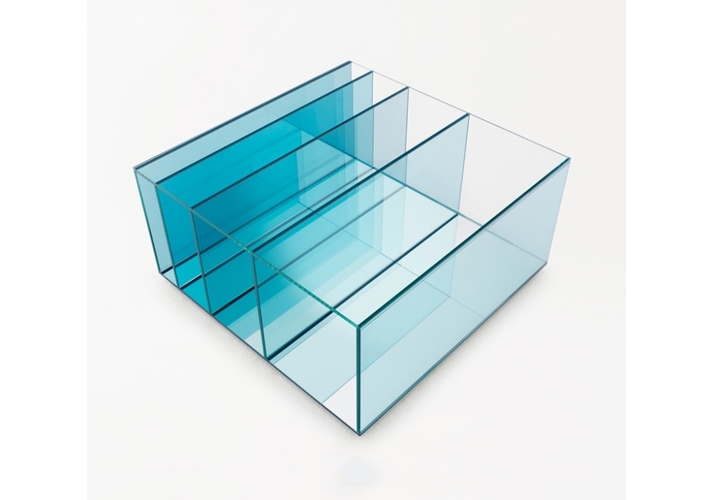 Deep Sea designed by Nendo for Glas Italia is a coffee table with top in stratified and heat-sealed transparent extralight glass. The vertical elements are in transparent colored glass in shades of gray or blue.