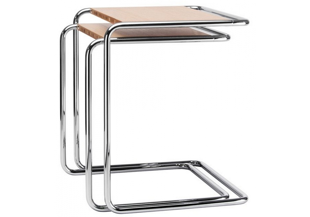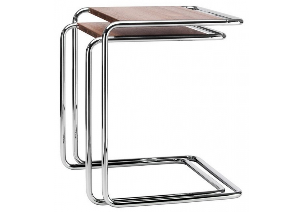 Set B 97 Pure Materials designed by Thonet is a set of two side tables with chromed tubular steel structure. Three-layer solid wood top available in different finishes.