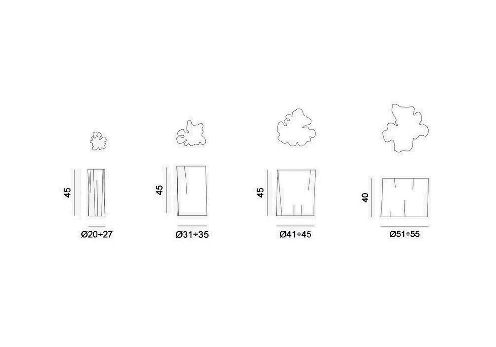 | Dimensions | Brick XS_ Ø (min 20; max 27) x H 45 cm; Brick S_ Ø (min 31; max 35) x H 45 cm; Brick M_ Ø (min 41; max 45) x H 45 cm; Brick L_ Ø (min 51; max 55) x H 40 cm; |