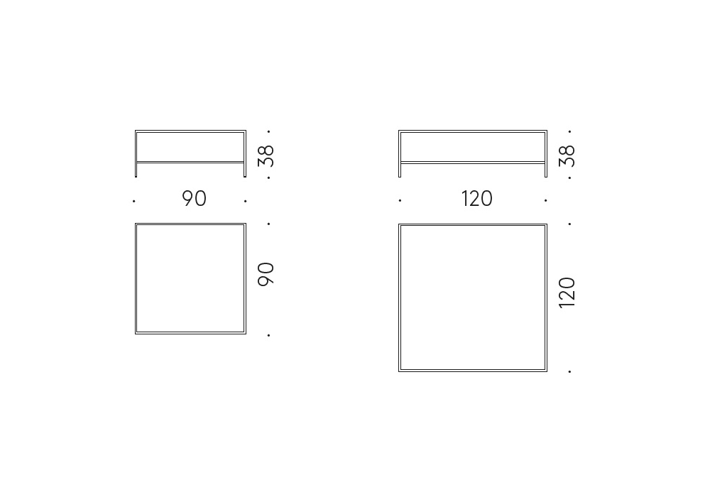 | Dimensions | 90 x 90 x H 38 cm; 120 x 120 x H 38 cm; |