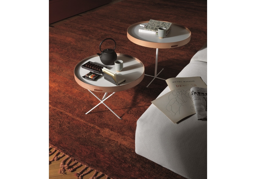 Chab - Table designed by Nendo for DePadova is a coffee table with base in black powder coated steel, feet in thermoplastic material and tray with birch plywood top. By rotating the base, two heights can be obtained which increase its flexibility of use, the top can also be used as a tray.