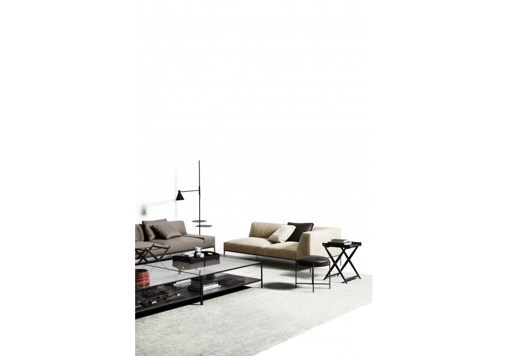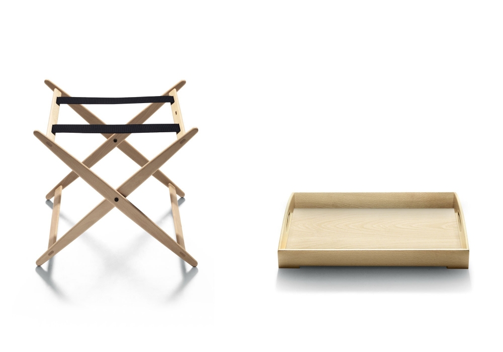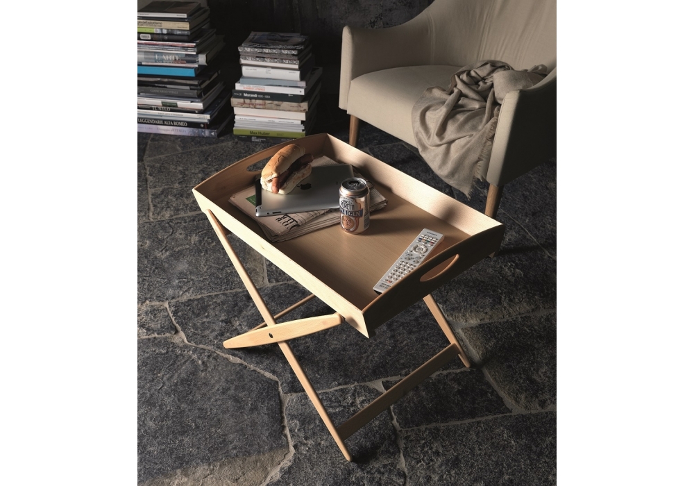 Mate designed by Achille Castiglioni for DePadova is a coffee table with folding base and structure in solid natural beech or solid charcoal ash and blue cotton straps. Birch plywood top.