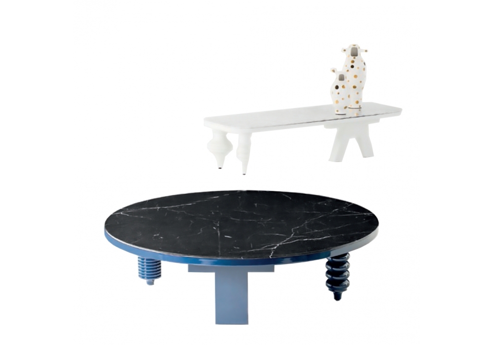 Marble Multileg Low designed by Jaime Hayon for BD Barcelona Design is a coffee table characterized by base and legs in turned solid alder wood, lacquered in white gloss or blue. Marble table tops in Carrara Venato or Nero Marquina.