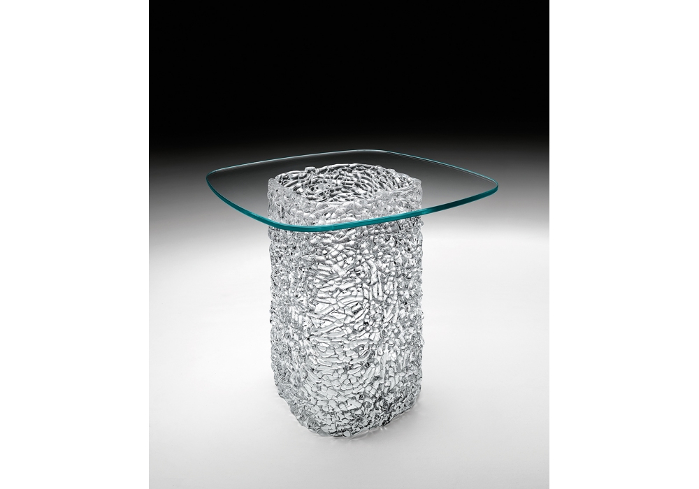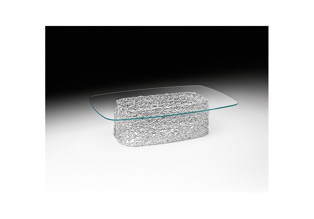 Macramé designed by Lucidi & Pevere for Fiam is a coffee table with base in hand-interwovenspun glass. Top in glass. Available in the following finishes: fumè grey, bronze and extralight.