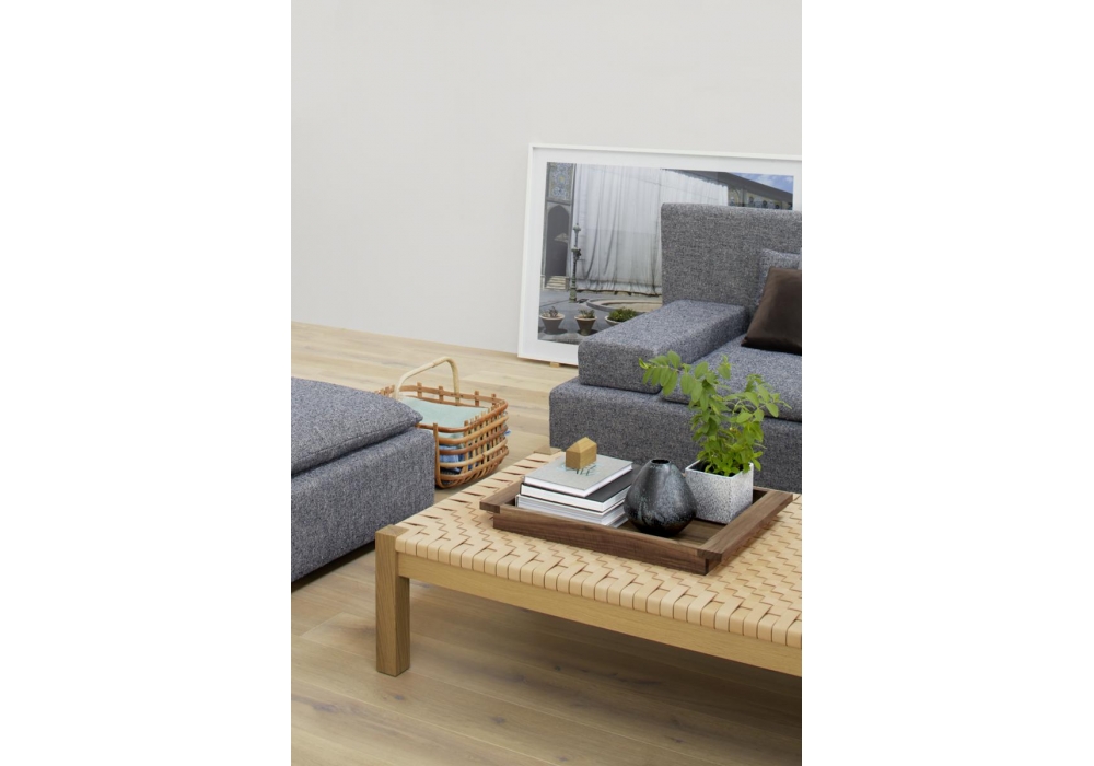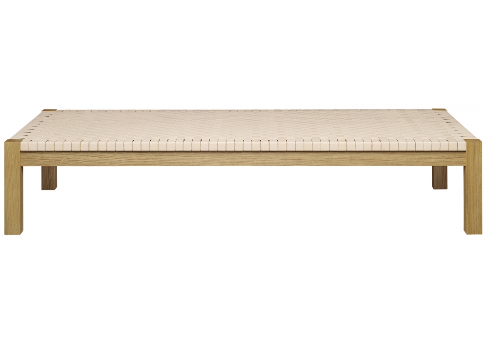 FK01 Theban designed by Ferdinand Kramer for E15 is a coffee table with structure in oak or walnut and fabric or leather seat. Theban with the iconic design and its reduced form offers various interpretations for its application and can be used as a coffee table or daybed. Available in more finishes and dimensions.