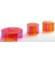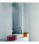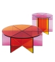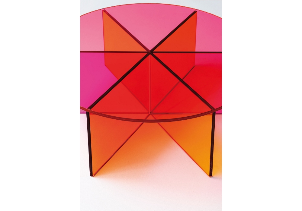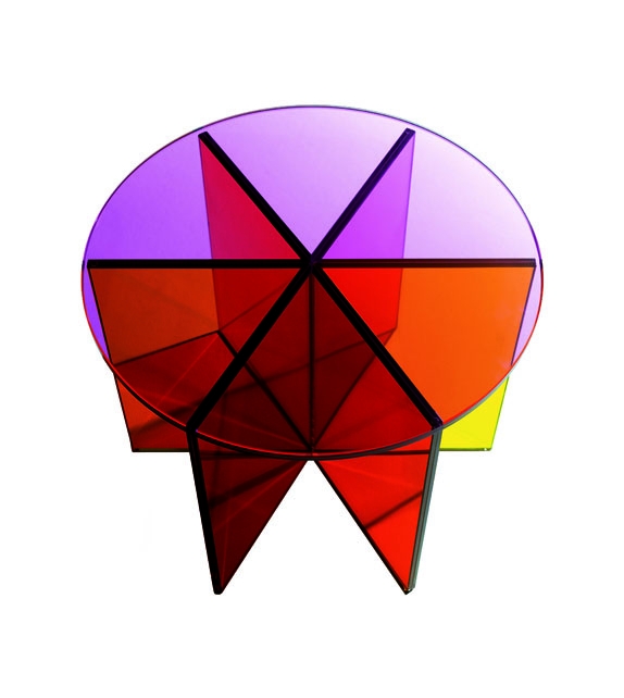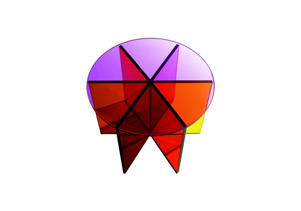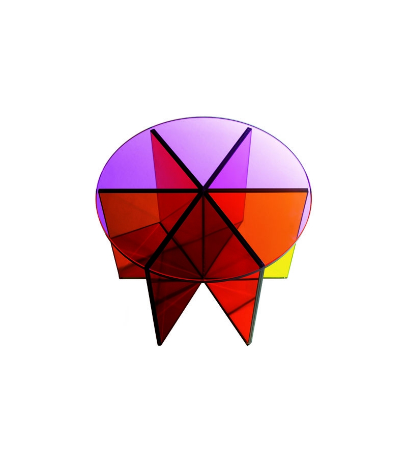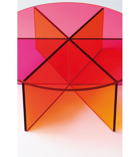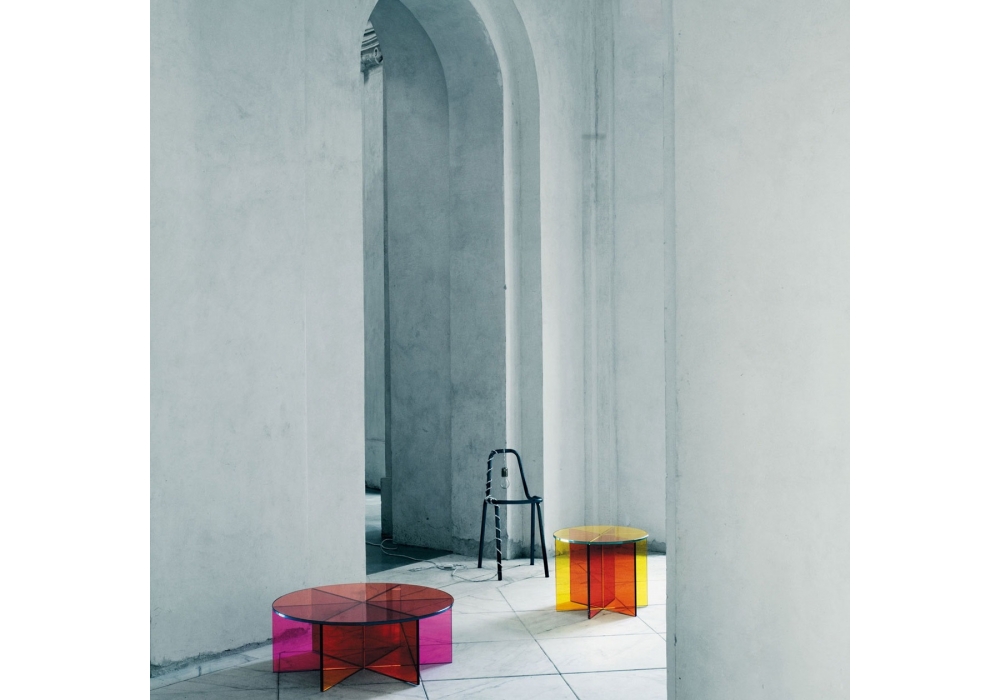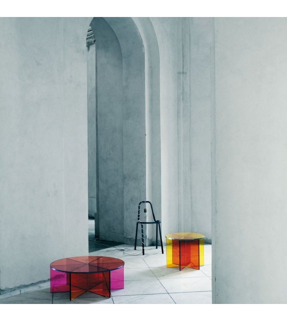 XXX designed by Johanna Grawunder for Glas Italia is a coffee table made of transparent pink, orange and yellow glass. The base is obtained by gluing six sheets of stratified crystal, with particular bevels. The top, in stratified glass, is available in one of the three colors of the base. The coffee table is available in two sizes.