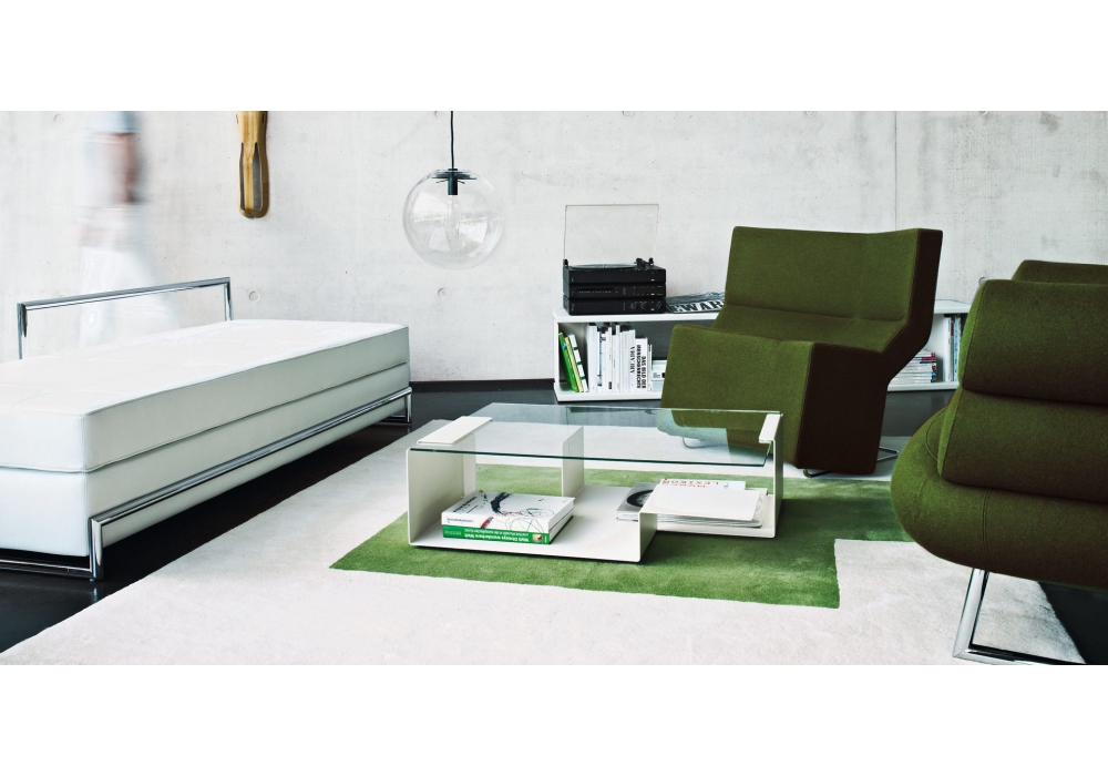 Diana D designed by Konstantin Grcic for ClassiCon is a coffee table with base of sheet steel. Powder-coated, fine texture. Bottom covered with polyethylene. Tabletop of clear crystal glass. Available in different finishes.