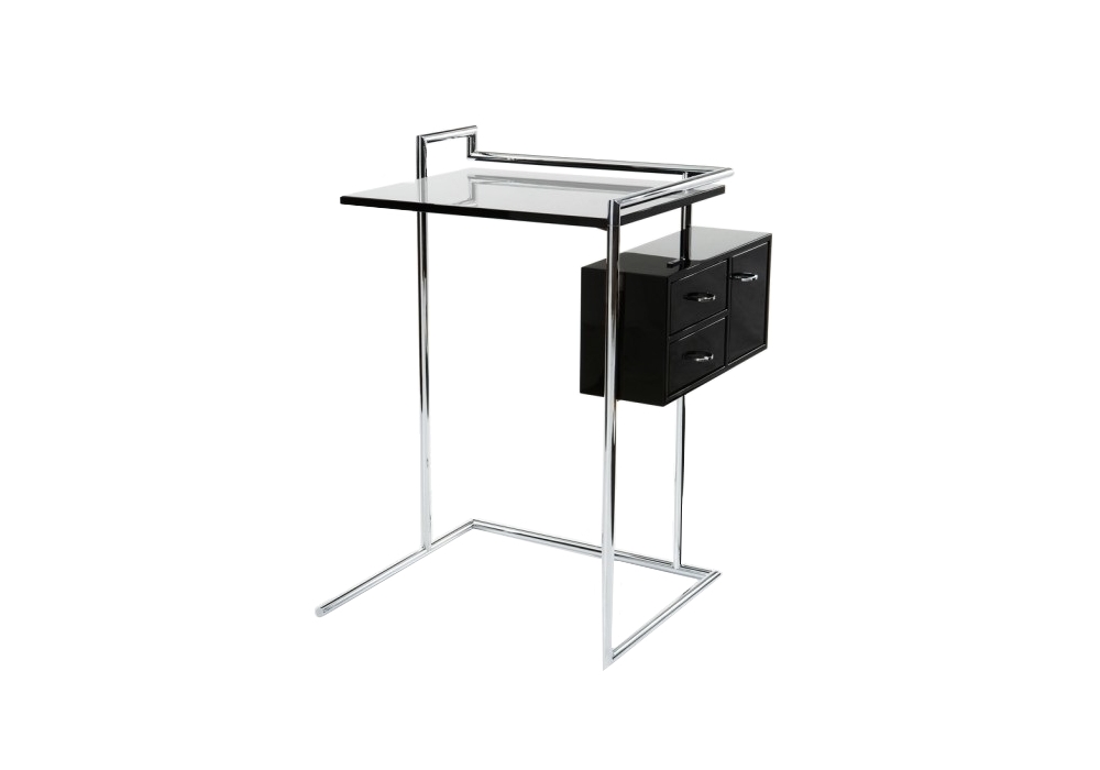 Petite Coiffeuse designed by Eileen Gray for ClassiCon is a dressing table consisting of tabletop and suspended box with two swivel-out drawers and one door. Frame of chromium-plated steel tubing. Tabletop and box of MDF high-gloss lacquer finish.