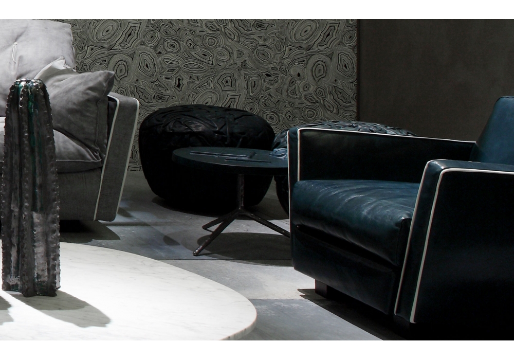 Pompei designed by Paola Navone for Baxter is a coffee tables collection. Cast aluminium etched frame. Unscrewable surface with leather upholstery carried out with an exclusive technique of manufacturing of leather, in order to create the shapes of the objects represented on the surface of the top. Available in natural or petroleum leather.