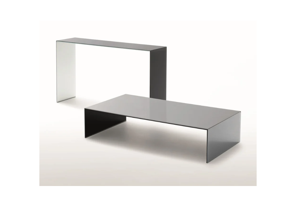 SiO2 Bridge designed by Piero Lissoni for Glas Italia is a bridge coffee table made of coupled laminated glass. Available in glossy or matt lacquered glass, with the possibility of freely combining the color of the internal finish with the external one.