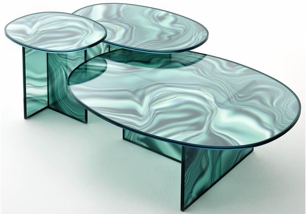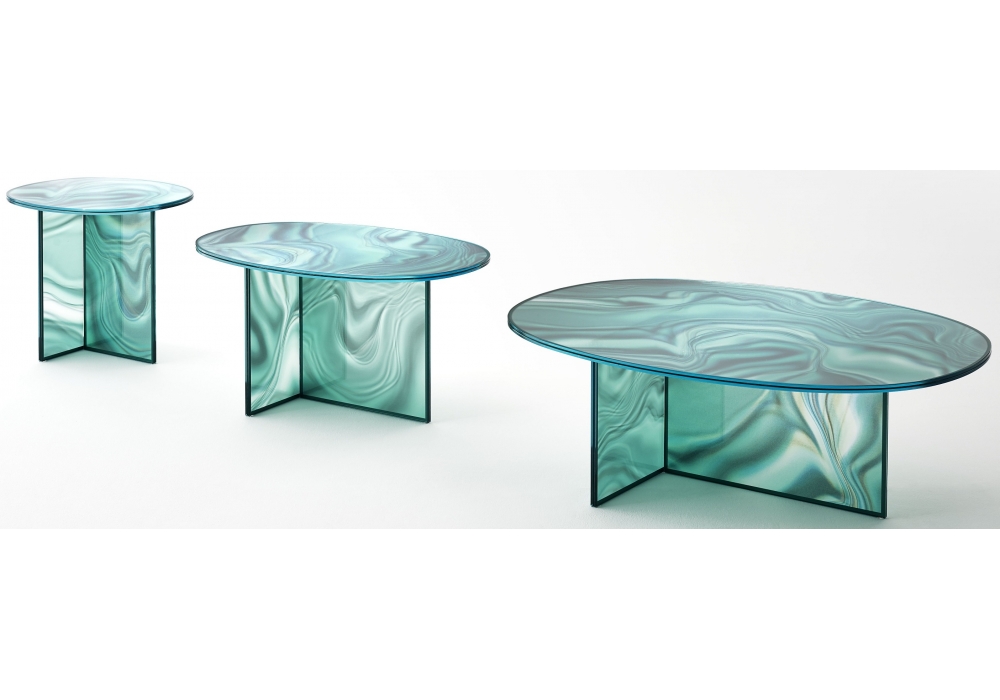 Liquefy designed by Patricia Urquiola for Glas Italia is an occasional table made of tempered transparent extralight crystal, with a decoration that resembles the marble. Thanks to a surprising effect, the veins seems dynamic and variables depending on the observation point. Available in different finishes and dimensions.