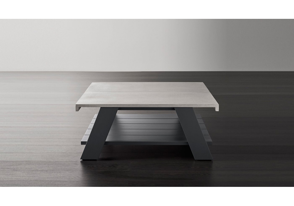 Joi designed by Andrea Parisio for Meridiani is a collection of tables with legs and crosspieces in matt, glossy or iroko lacquered finish and the top in matt or glossy lacquered MDF or fiber-reinforced UHPC concrete.