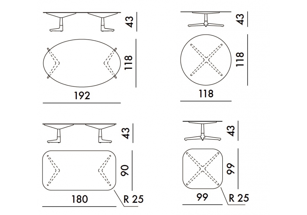 | Dimensions | 192 x 118 x H 43 cm; 180 x 90 x H 43 cm; 99 x 99 x H 43 cm; Ø 118 x H 43 cm. |