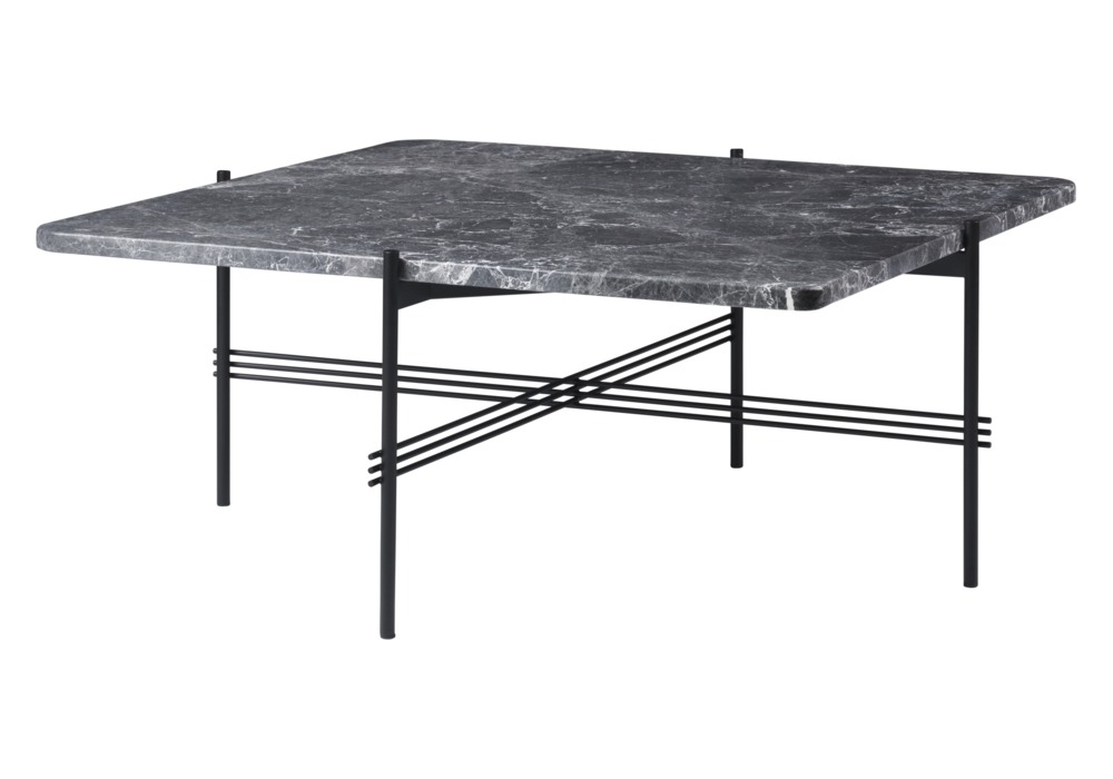 Ts designed by GamFratesi for Gubi is a square coffee table with black painted structure and marble top. Available in different finishes and dimensions.