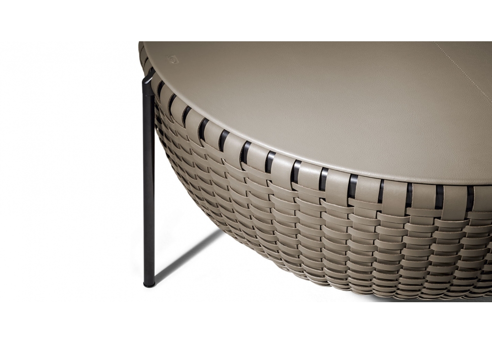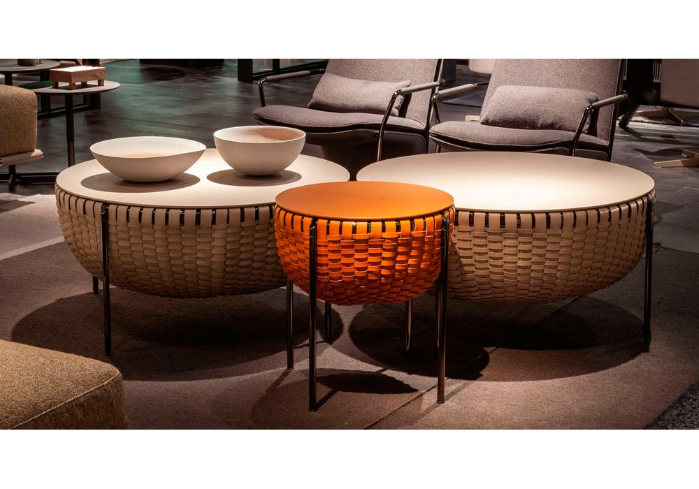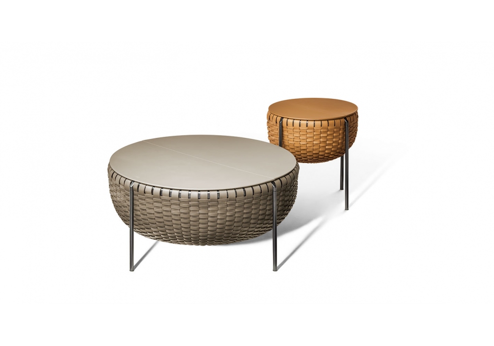 Cestlavie designed by GamFratesi for Poltrona Frau is an occasional table with storage. Tubular aluminum structure and steel legs. Basket made with woven strips of Cuoio Saddle Extra leather in different finishes. Wood fiber top. Available in two dimensions.