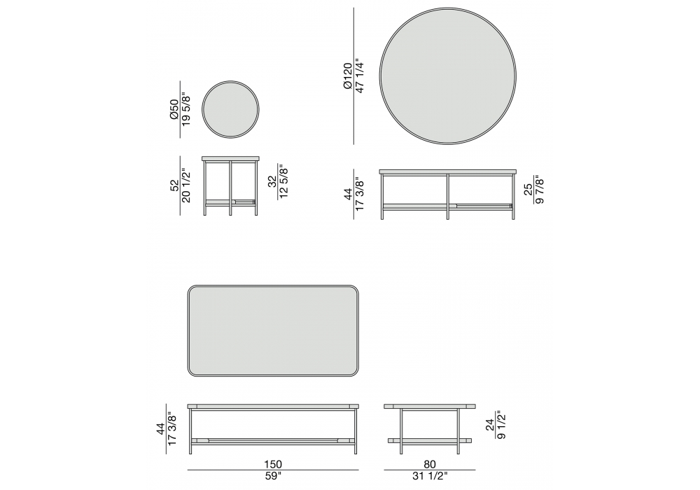 | Dimensions | Ø 50 x H 52 cm; Ø 120 x H 44 cm; L 150 x W 80 x H 44 cm |