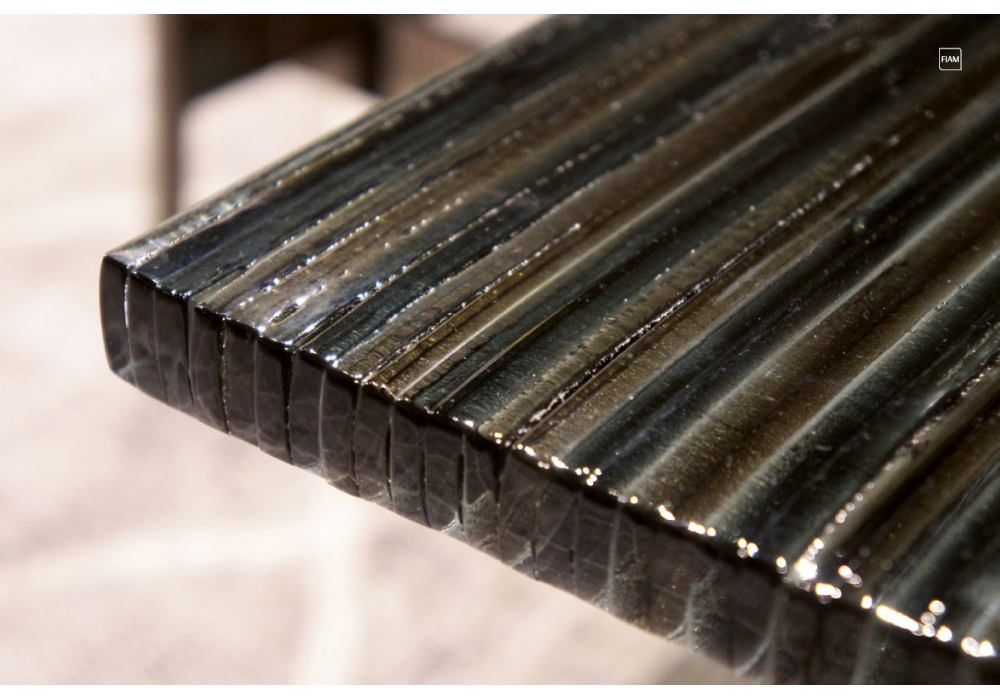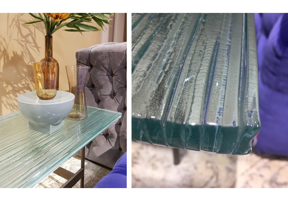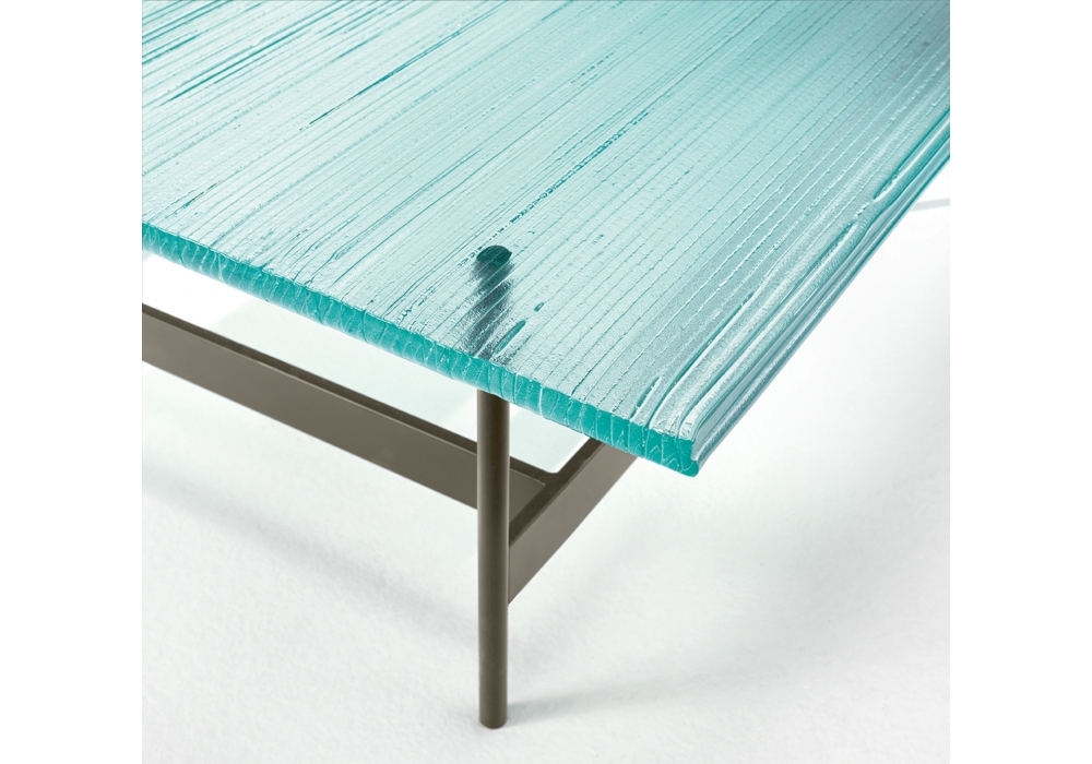 Waves designed by Ludovica + Roberto Palomba for Fiam is an occasional table with top made of transparent DV Glass, colored stripes or marble. Metal base in matt titanium or shiny black nickel finish. Optional lower shelf.