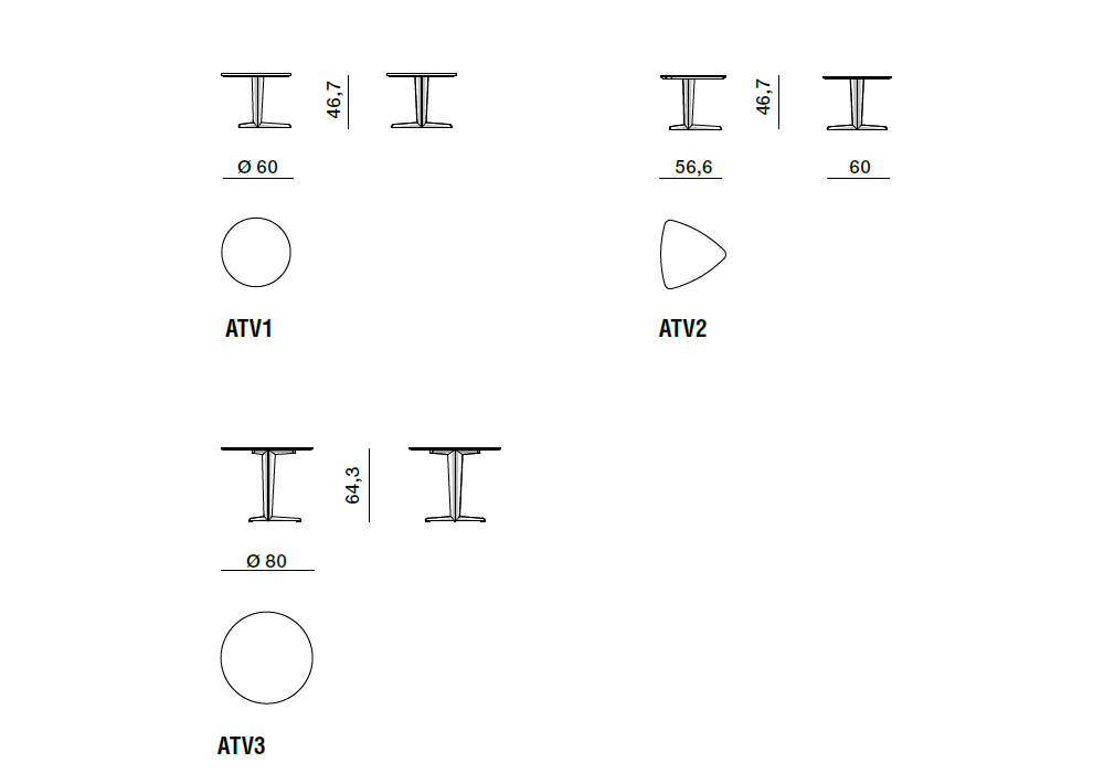 | Dimensions | Ø 60 x H 46.7 cm; 56.6 x 60 x H 46.7 cm; Ø 80 x H 64.3 cm. |