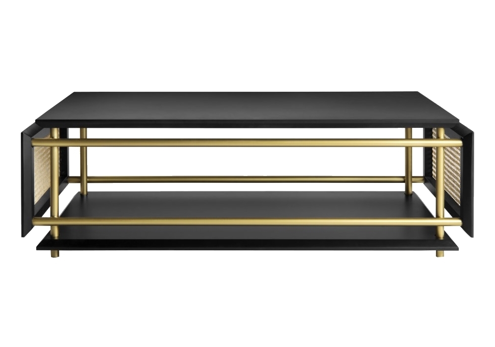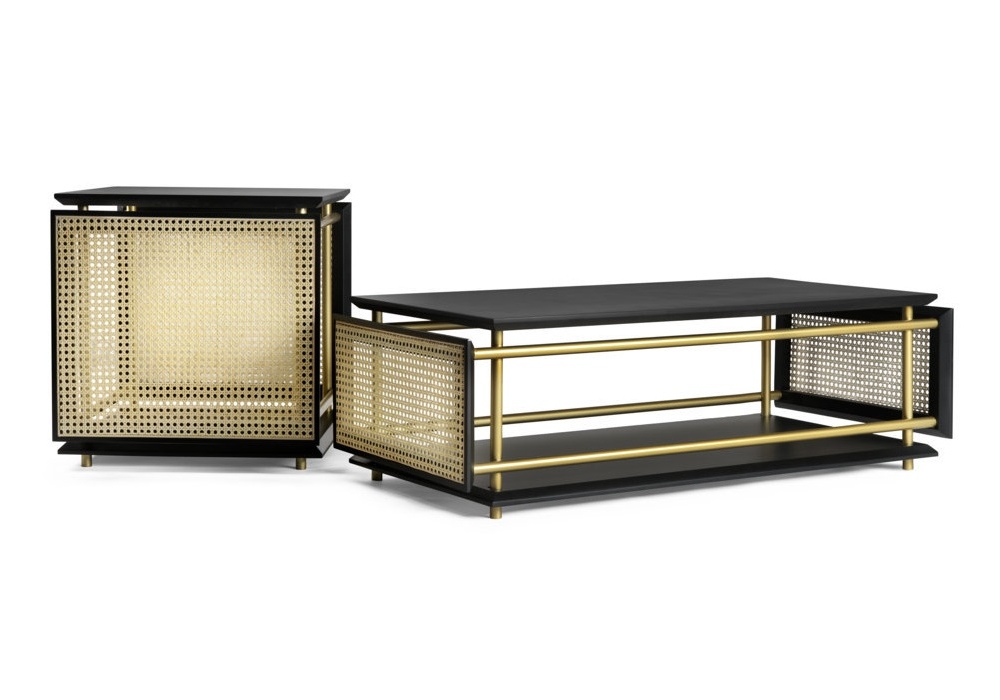 Wiener Box designed by Cristian Mohaded for Gebrüder Thonet Vienna is a coffee table with brass-finished metal frame. Top and base in lacquered black mat wood. Woven cane side panels with solid beech frame.