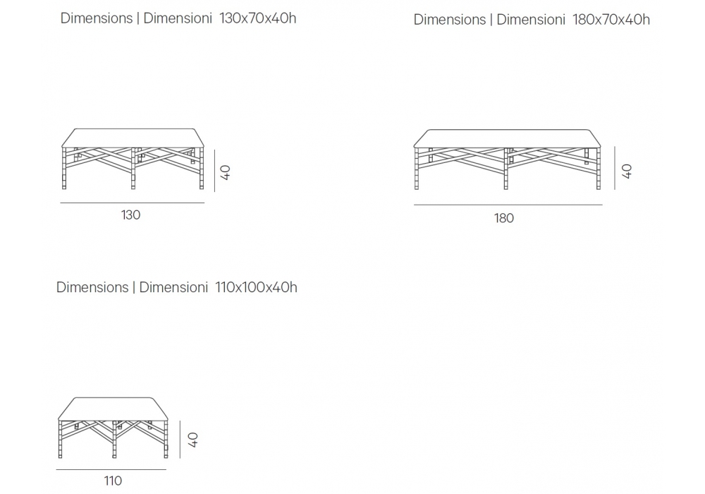 | Dimensions | 130 x 70 x H 40 cm; 180 x 70 x H 40 cm; 110 x 100 x H 40 cm. |