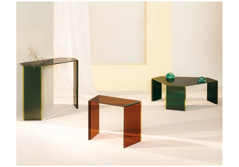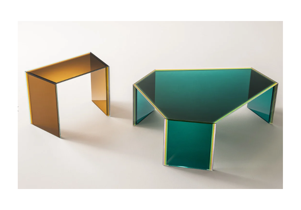 Bisel designed by Patricia Urquiola for Glas Italia is a coffee table made in multi-layered and multichromatic glass, created by laminating five slabs of 5 mm extralight glass each with a different coloured film. Available in 2 types.