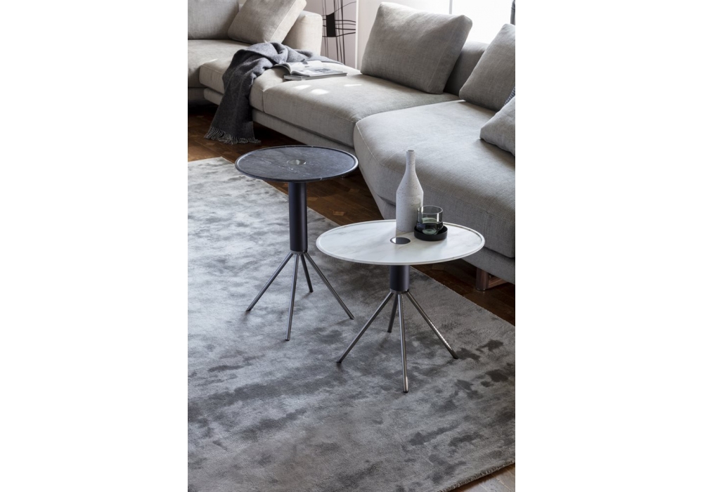 Jelly Marble designed by Carlo Ballabio for Porada is a coffee table with base in black chrome metal or brushed brass. Marble top with low-profile hydro-stain oil finish in white calacatta gold or carnico gray finishes. Central column in solid canaletta walnut or wengè stained canaletta walnut. Table top available in oval or round shape, in two heights.