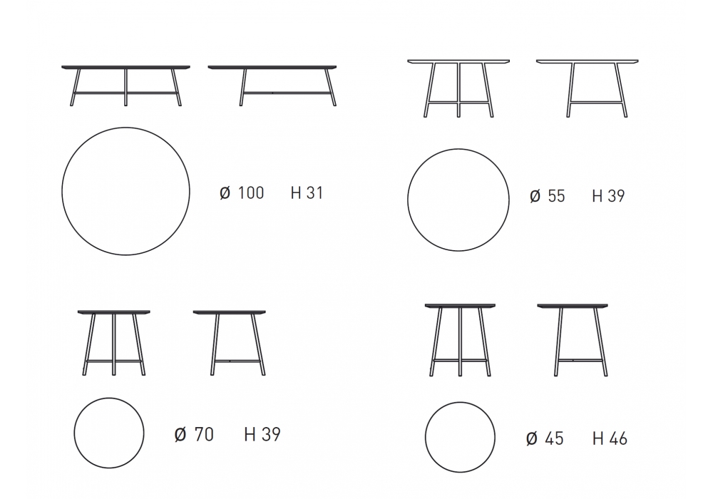 | Diameter of the top | Ø 100 cm; Ø 55 cm; Ø 70 cm; Ø 45 cm. |
