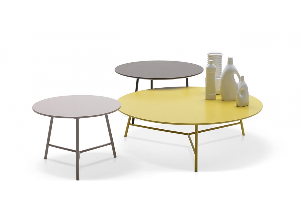Boogie designed by Angeletti Ruzza for My Home Collection is a coffee table made with a painted or chromed three-legged tubular steel base. The top is circular in lacquered MDF or marble. Boogie is available in different finishes and sizes.