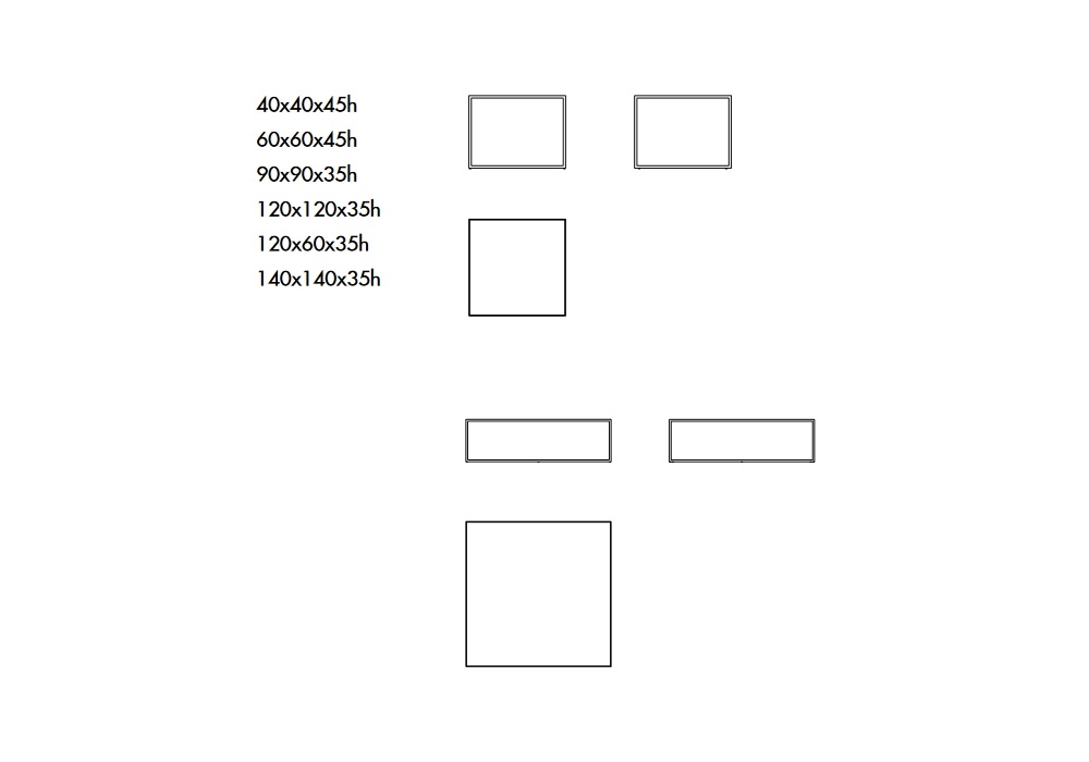 | Dimensions | 40 x 40 x H 45 cm; 60 x 60 x H 45 cm; 90 x 90 x H 35 cm; 120 x 120 x H 35 cm; 120 x 60 x H 35 cm; 140 x 140 x H 35 cm; |
